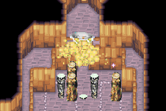 The final room inside Air's Rock consists of platforms floating above a thick, purple fog. Hop straight up along the platforms (which disappear behind you) to reach a tablet that will teach Sheba the Reveal Psynergy in a short cutscene. Now hop across the west trail of platforms, approach the circle of floating platforms, and cast Reveal to make a platform hovering in the empty space in the center materialize (all such circular arrangements of objects in the game will expose secrets when Reveal is cast on them in this manner); this brings you to a chest in the southwest containing a Psy Crystal. Since Retreat does not work in this chamber specifically, now hop back to the main platform and take the right trail of floating platforms to get back to the exit, again using Reveal to get past the "empty" circle of six floating platforms in your way. As soon as you step back out into the multi-story chamber, Retreat can be used to deposit you next to where you can step back out into the exterior, and casting Retreat again will deposit you at the bottom of the initial sand maze.