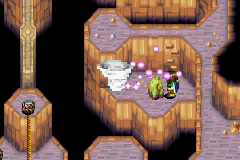 Now in the fourth floor from the top, still in the left "blue" side of the interior, you can take a detour left into the southwest part of the area for a chest with an Elixir if you wish. Take the north fork and follow along a very long, winding route through this floor until you hop left across a gap near a Wind Stone and a tightrope leading up. Cast Whirlwind to have the Wind Stone push the rotating pathway up north into a vertical alignment, then walk north along the tightrope and the rotated pathway and climb down to another Wind Stone east of it. Shoot out a whirlwind west to align the rotating pathway horizontally again, and hop west across it. Do not slide down the cliff slide you soon reach as you approach the earth pillar and tightrope just left of it. Follow along with another fairly long yet linear path until you exit the screen.