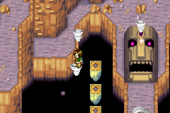 From the area of the purple "Whirlwind stone," follow along east to another "T-intersection" pointed east where there are four rocks, then head southwest to another fork. Head northeast toward the northeastern corner of the maze and cast Whirlwind west through the Wind Stone there to clear away a sand obstruction blocking a chest that will be gotten later. Hug the eastern edge of the screen as you go all the way south to the southeast corner of the maze and cast Whirlwind west through that Wind Stone to clear another sand obstruction. Now head counter-clockwise past and around the mass of scattered purple rocks a short ways north of that Wind Stone so that you can get down to the area left of it and head west through the route you just opened up. You will be standing underneath another Wind Stone, and this time, send two Whirlwinds flying north in a row to clear two sandy obstructions in a line.