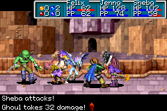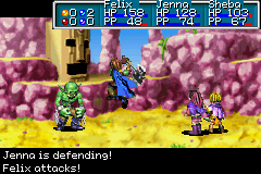 The dungeon itself makes liberal use of the Whirlwind Psynergy that can only be used by Sheba while she is in the mono-elemental Wind Seer class series, which effectively forces her into having no Djinn other than Jupiter Djinn set onto her. This will likely strain her PP reserves over time, so it is a feasible option for the player to ignore Air's Rock and proceed with the main story of the game until they have added the Mercury Adept Piers as the party's fourth member. By that point roughly 30% into the game, the party will have easier access to the Avoid Psynergy (though either setting two Mercury Djinn or equipping the Mysterious Card on either Felix or Jenna will make Avoid possible to cast even without Piers in the party), and they will all be at higher levels, which will give Sheba more PP reserves and make Avoid more effective at preventing any random encounters whatsoever. Bringing the larger party into Air's Rock is easily done by sailing the ship south around Osenia and mooring it at the small river and twin beaches east of the thick mass of rocks preventing you from sailing into the western sea.