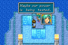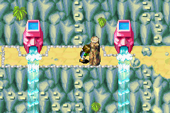 Once you have cast Douse on the Aqua Stone at Apojii Islands, the five green water-spouting moai that previously blocked your entrance will have moved aside. Follow along until you climb up a ladder, where small waterfall streams will regularly disappear at both your left and your right. You can cross these streams without falling off the cliff by pressing diagonally upward while running through them. It is possible to enter the bottom of the interior portion by walking through the cave wall covered by a thick waterfall just southeast of your position, but you cannot do anything there yet.