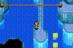 Proceed northeast into the chamber with the earth pillar you saw a short time earlier and move it two tiles to the right, head further north, slot another earth pillar into its recess northwest of it, and climb up the northwest stairs. Follow along across a tightrope and hop south across a set of yellow platforms to reach one more moai-and-water puzzle room, which is a large-scale version of a much earlier puzzle with yellow pillars. Move the left "south-and-east" pillar far to the northeast corner of the white outline denoting the movable space, then move the "west-and-south" pillar that was right of that pillar two tiles left. Move the "west-and-north" pillar southwest so that it is four tiles right of the southwest "north-and-east" pillar. All the pillars should be evenly spaced apart, so fill the room with water and cast Douse on the Aqua Stone to create the magic bridge leading to the northeast exit.