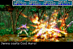 In terms of playable characters, the Aura series is available only to the Flame User class series, specifically to the stages of Hex and above. Thus, the series is unique to the Mars Adept Jenna. In order to gain access to this series, Jenna must have at least four Mars Djinn set, and may not have Djinn of any other element set. Aura is learned at level 9, Healing Aura at level 16, and Cool Aura at level 33.