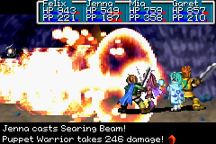 Therefore, a Searing Beam cast under these circumstances would deal approximately 255 points of damage to the targeted enemy. Since Searing Beam is a ranged Psynergy, adjacent targets take a percentage of the total damage, with the percentage decreasing as distance from the main target increases. |