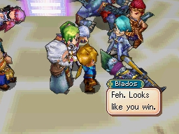 Despite Blados bringing his punishing sword techniques to bear, he and Chalis are unable to outlast all five battle-hardened Adepts fighting at once and are left lying on the ground wounded. Though Blados deigns to commend his opponents' victory in their battle, he remarks that his side did ultimately "win the war." The Adepts realize too late that their battle had given Arcanus the cover he needed to forcefully bring Ryu Kou to the dread machine's interface and convince him to insert the Magma Orb. Eclipse Tower initiates its ominous rise behind Belinsk, and Arcanus hastily evacuates the tower by picking up both Blados and Chalis and warping along with them in the direction of the exit. Neither Blados nor Chalis contribute any additional commentary throughout all of this.