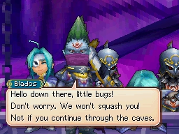 Blados and Arcanus lower themselves into view using a lift and reveal that they have taken Rief captive, and they coerce Matthew's party into taking Konpa Cave's south exit into Ei-Jei by explaining they will leave Rief vulnerably tied up near it. They also separate Kraden and Nowell from the rest and strand the two in Angara's upper half, near Bilibin. The Adepts protest being diverted from their trip north through Bilibin and into Morgal, and Blados frustratedly expresses he would love to cut them down now, were it not for his sworn duty handed down by his superior. (Blados suggests that a personal consolation he sees in letting them live is that they might become worthy adversaries to him someday, and he name-drops Karis' father, Ivan, to illustrate his expectations for the Adepts.)