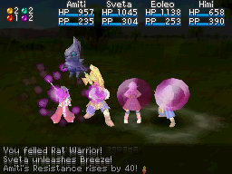 Golden Sun: Dark Dawn: Breeze remains a good support method for a non-warrior Adept to use, though bosses in the game are not as threatening to the party, for the most part. Breeze and its identical counterpart, the Mercury Djinni Mellow, are best used in the final boss battle and the optional boss battle against the Star Magician, who have a lot of damaging multi-target elemental attacks. The fact that two turns of PP-free Resist-casting transpires in one turn grants the user more opportunity to do other important things on the next turn, which is important in both these battles. Incidentally, while this Djinni comes with Sveta, Breeze should immediately be traded onto Karis (if she is in her mono-elemental Jupiter class series) because Karis is in a "caster role" and typically not used for attacking, while Sveta is all about physical assaults and would be better off used for attacking than using up one of her turns to support the party's Resistance ratings.