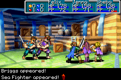 Assuming the player acquired it in Air's Rock, the Flora summon is an excellent choice for this battle, due to the high damage potential as well as the chance to inflict Sleep on either of the Sea Fighters onscreen. Furthermore, if Felix has reached level 13, he will have access to the Ragnarok Psynergy in his default class, which is an excellent offensive choice.