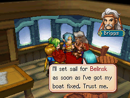Some time later, progress on the breaking ship's repairs have not been going well, and Briggs spends more time sleeping in the captain's quarters because of his age. Matthew and his group return to him after having met Tret and used the Hermes Water to do so, and upon waking up he is slightly disappointed that Eoleo wasn't rescued already. He is glum to learn that Tret did not offer advice on how to attack Belinsk by land, but the Adepts say that they still need to go to Belinsk, where they might meet up with Ryu Kou, whom they had encountered on their trip. Briggs has heard of Ryu Kou before, the prince of the eastern Angaran country of Sana whose sister had been captured by Volechek as well, and he states in clear terms that he refuses their request to help Ryu Kou while he is busy rescuing his only son Eoleo.