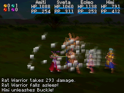 General: The mass-defense-boosting effect that Buckle and other identical Djinn provide is a highly effective buffing effect in any of the games because many enemies' attacks are physically based and will be lowered a large amount, justifying the turn an Adept takes to cast it. However, the additional defense works bests against enemies without many offensive Psynergy or monster skills that are based on elemental power rather than elemental physical attacks.