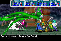 However, the Elemental Cards are much more useful. When learned, each Card is fairly powerful, and allow the Pierrot to take advantage of any elemental weakness. More specifically, Flame Card is slightly weaker than Flare Storm, but is learned earlier. Thunder Card is equal in power to Shine Plasma, but is learned earlier and is cheaper. Bramble Card is weaker, but cheaper than Nettle, and can be useful against Moapa. Frost Card is learned later, but is both more powerful and expensive than Ice Missile. It is excellent when cast by a Mercury Adept, and is an excellent option for fighting Flame Dragon enemy line.