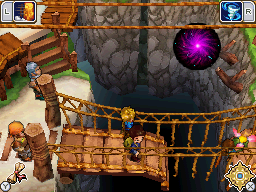 When Matthew's party of Adepts is tasked with retrieving a Mountain Roc feather, Matthew's father Isaac instructs the group to meet Kraden here before beginning the trek through Bilibin. However, when they arrive, they are met with an interesting quandary: A Psynergy Vortex has blown up the bridge and a child hangs on for dear life to a wind blossom attached to the rubble. Luckily, Karis's Whirlwind Psynergy helps the child land on the Bilibin side of the bridge.