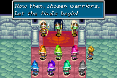 The Colosso Final Competitions is the final portion of the overall Colosso tournament at Tolbi, following the Colosso preliminaries, where the eight highest ranked Colosso Gladiators from the Colosso trials face off in a series of puzzle-like races that each ends in a one-on-one duel. In terms of story, after Isaac saves the life of the lord of Tolbi, Babi, within Altmiller Cave, Babi personally enters Isaac in Colosso's finals so that he may observe Isaac's Psynergy powers in action. From a gameplay perspective, Isaac's competing in the Colosso Finals is a major and unique mandatory episode for the overall Golden Sun series, with a similar type of gameplay event taking place in Golden Sun: The Lost Age at Trial Road.