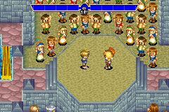 After placing each Adept in the stage's audience, Isaac heads off for the match that's about to begin, and the "Lend a Hand!" mode begins, where you control each of Isaac's individual party members within their small audience-filled cells temporarily. This is the only instance in the entire Golden Sun series where the player can actually physically control Garet, Ivan, and Mia in an overhead-style environment, and you'll find that while their walking animations have been coded, their running animations are merely sped-up versions, unlike Isaac's running animations which are different from his walking. When your control is shifted to a different Adept, you can try to see if there is a nearby stage element that can be changed by one of your Psynergy spells and therefore create a shortcut that will help Isaac go through that stage faster. Your session with that Adept will end if he/she successfully makes a change, but if the Adept is unable to do anything they will have to end their session by talking to the attendant below and say they're done cheering.
