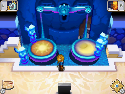 - Aquarius (The Water-Bearer): Go four doors right to the door at the northeastern diagonal. In this hallway, stand at the white ground to the left of the dark, circular portion with a gray spire on it, and cast Grip to rotate it ninety degrees. It can now be crossed as a path north. At the north door, cast Fireball at the chest so that it falls to the ground. Enter the room where a glyph tablet reads "LIFT THE JUG HIGH AND RECEIVE THE BOUNTY OF RAIN." Cast the Douse Psynergy on the pot-holding statue. This opens up both the Virgo and Libra rooms in the hub. Go back down through the hallway, and once on the solid ground below the dark circular portion with the spire, Grip the spire again to rotate it ninety degrees back. This creates a path to the chest you dropped, and it contains the Spiked Armor. Go back to the hub.