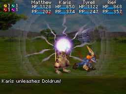 When Doldrum is unleashed in battle, the user produces an effect that prevents the next one action that the target has not performed yet this turn from executing. If an enemy only has one action per turn, it will essentially be prevented from doing anything this turn, while an enemy that acts twice per turn will only act once. This effect has the "strikes first" property, meaning it will be the first performed action in a given turn regardless of the agility rating of the user and any other combatant in battle.