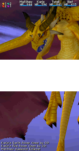 In all its appearances, Eclipse's summon sequence features a titanic orange dragon above the world’s atmosphere launch a beam attack from its mouth onto the landscape below, engulfing the enemy and the rest of the landscape in a humongous explosion. However, in Dark Dawn, the dragon is a 3-D render rather than the sprite of The Lost Age.