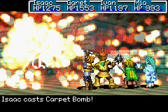 Therefore, a Carpet Bomb cast under these circumstances would deal approximately 195 points of damage to the targeted enemy. Since Carpet Bomb is a ranged Psynergy, adjacent targets take a percentage of the total damage, with the percentage decreasing as distance from the main target increases. |