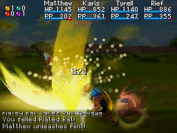 Visually, Flint's unleash animation is fairly simple. In Golden Sun and The Lost Age, the user leaps forward and strikes the target, similar to a normal attack but with some yellow coloration to reflect that it is a Venus attack. As of Dark Dawn, the user still leaps through the air, but a 3D model of Flint hovers behind them and, when the user strikes the target, their weapon and the area of ground underneath and behind the target glows yellow.