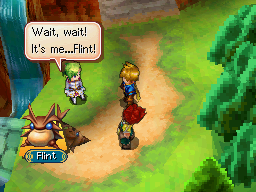 The following day, Matthew, Karis, and Tyrell leave Isaac and Garet's cabin on a quest to acquire a key component to a device Tyrell broke during their brief adventure the night before. Although Isaac cannot see them off in person, he sends Flint to deliver a message to them, as well as to aid them in their journey. However, the young Adepts initially mistake Flint for a wild Djinni and try to capture it. After clearing up their confusion, Flint delivers Isaac's message: While passing though Patcher's Place nearby, they should visit the Psynergy Training Grounds, then make their way to Carver's Camp to meet the elderly scholar Kraden.