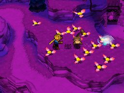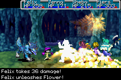 Golden Sun: The Lost Age: Flower is located in Taopo Swamp, and is pretty much the "main reward of interest" of the quadrant of the swamp's caves it is located in (whereas a piece of Star Dust is the main reward of interest in the other main quadrant of the caves). When you see it, it is standing unreachable at the edge of an abyss with an air spout on the cave wall above it. On either side of it is an earth pillar that can be pushed in front of an air spout. When both earth pillars are covering an air spout each, Flower will be blown off the edge and fall to the floor below. To properly follow it, slide down the second cliff slide to the right of Flower's position. It must be battled to be obtained, though definitely save before trying to get it. See here for enemy statistics.