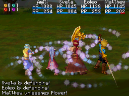 When Flower is unleashed in battle, all non-downed Adepts in the current battling party are cured by 30% of their maximum HP meters.