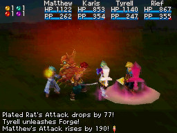 General: The mass-attack-boosting effect that Forge and other Djinn have is easily one of the best buffing effects in any of the games because the party's damage outputs with any action based on their physical attack statistics will be significantly increased, highly justifying the turn an Adept takes to cast it. Forge is useful from when it is first found all the way to the endgame of each game it appears in. It is probably best to have it Set onto an Adept that has low attack rating and is dedicated to supporting the party to begin with, so that other, damage-dealing Adepts won't have to interrupt their attacking procedures in order to unleash Forge.