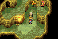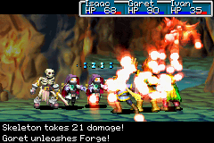 Golden Sun: Forge resides in Goma Cave, on an elevated ledge near a person bystanding on the ground level. Talking to the bystander indicates to first-time players that wild Djinn like Forge must be defeated in battle in order to add it to their Djinn collection, but they have the ability to flee the battle - but the Djinni will reappear in exactly the same position if one leaves and reenters the immediate area. An earth pillar near the bystander and the Djinni must be pushed right, then up onto the circular indentation in the ground where the pillar will stay permanently. Then the party continues to go through the dungeon, and will eventually make it to the elevated portion of the area where they can hop across the earth pillar and initiate the battle with Forge. Once it is successfully defeated and acquired, the bystander will be impressed and leave. See here for enemy statistics.