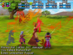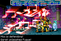 When Fugue is unleashed in battle, all enemies flinch as though they are hit by an elemental power move, such as a Psynergy, with a power rating of 18. However, it is not the affected targets' HP meters that take the damage, but their PP meters. All enemies take the full PP damage of the attack - there is no damage reduction for enemies off to the side of the designated target. Mars Power and Resistance ratings apply. In the GBA games' Battle Mode however, it has a secondary effect of draining a random Djinni from a party member in the linked arena.