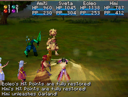 General: While there are very few healing effects in any of the games that restore HP based on a percentage, Garland is generally the least useful because other Djinn that heal by a percentage either heal by a larger percentage or offer some separate advantage to make up for not healing as much, like group healing or acting with increased priority. Unless you are planning to set up for a Venus-element summon by unleashing Garland to heal an Adept's HP, the Cure Psynergy series is overall better despite the PP cost, at least until late in the game - when Garland would probably heal more of an Adept's huge HP meter than Potent Cure. In the GBA games, the Mercury Djinni Fizz is this Djinni's identical equivalent.