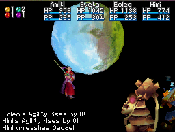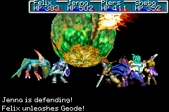 And yet, despite all this, Geode may no longer be the most powerful attack Djinni in the game. That honor probably belongs to the Venus Djinni Chain, whose attack is equivalent to the total of all of your currently active party members performing a normal physical attack on the target at the same time. With four party members alive, even if some of your party members are not powerful with their physical strikes, the four-strikes-in-one that Chain causes will most likely add up to be stronger than Geode by a potentially wide margin. How much stronger Chain will be than Geode depends on how high the total Attack ratings of all four currently battling Adepts are, of course.