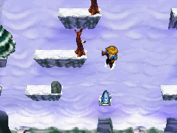 Golden Sun: Dark Dawn: Geyser is located in the small Snowdrift Shrine dungeon that is one of the dungeons you need to explore late in the game in order to collect the Umbra Gear. When you enter the main lower exterior screen and climb up the right ladder to the main upper exterior screen, you are above a giant slide that you would need to slide down at several different places in order to reach all of the location's secrets. Geyser is at the top of the center of the slide, and when you approach it, it will slide down to a lone platform way down below. Your objective is to slide down after it and steer yourself so that you collide into it from behind, and a little reflex might be needed. When successfully crashed into, Geyser drops into the screen below, so hop off and climb down the nearby ladders to where Geyser is. Fight it to obtain it. After this, when you climb back up to use the giant slide again, know that there is no further use for the particular slide entrance that Geyser used. The same goes for the slide entrance to the right of that. See here for enemy statistics.