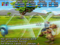 General: Geyser is a rare effect that attempts to remove the enemy from the battle once the hit has been carried out. Removing the enemy is essentially the same as inflicting instant death on it, but with one critical flaw: the enemy's EXP, coin rewards, and droppable loot will not be awarded like when you fell an enemy normally. This generally makes Geyser a highly frowned-upon Djinni because unlike a Djinni or effect that inflicts instant death, Geyser is likely to deny you the rewards you would want for going through random battles. (Naturally, this blowing-away won't work on bosses with their high Luck ratings.) Its set damage bonus isn't even all that great, at 50, and while it's true its blowing-away effect does not happen if the hit actually would KO an enemy anyway, generally one would want to rely on other attacking Djinn to avoid any risk of not getting the payoff of defeating a monster. In The Lost Age, the Jupiter Djinni Gale has the same "blowing away" chance.