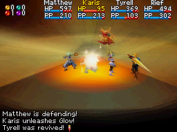 General: Among Djinn that an Adept without the Revive Psynergy can use to try to revive allies without relying on Water of Life items, Glow's effect is merely average, because it is far superior to the Djinn that only have a 60% chance to restore an Adept to 60% HP, but inferior to Tinder, which has a 100% chance to restore an Adept to 100% HP. Most of the time this will perform its intended function of mostly reviving the downed ally, though once in a while it will actually miss. This iffiness basically means that if the Adept it is set on is using it, it should be part of a strategy where the Djinni being On Standby will be used for a Mars Summon like Meteor or Haures in one of the following turns. Glow is the Dark Dawn equivalent to the Mercury Djinni Dew in the GBA games.