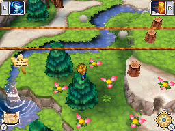 In the next screen, push the log in front of you. Of the four logs now grouped together, push the upper-right vertical one left so that you can push the right horizontal one down, and then push the left horizontal one all the way down. Push the upper right vertical one back right, then the right horizontal one back up; this clears the way to roll the left vertical log all the way into the river on the right. To capitalize on this, climb down either tree, then hop right from the log; to get to the elevated chest, position yourself immediately right of the nearby tree and cast Whirlwind in a straight line to make two Wind Blossoms hover, then quickly climb the tree and hop across them. This grants you the powerful Themis' Axe artifact. Climb back up one of the other two trees and follow the winding elevated trail north of the two signs, hopping across the chasm with a narrow waterfall and eventually exiting out of the right screen into Carver's Camp.