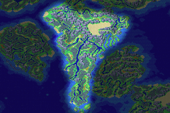 Geographically, Gondowan has coastline on both the Western and Eastern Oceans and is roughly in the shape of an upside down triangle, as well as South America. It is also connected by land to Angara to the north and is bound by the Western Sea in the south and west, the Eastern Sea in the east, and a large river south of the land-locked Karagol Sea in the north. The land around the Karagol Sea north of that river is in fact part of Angara, and a large drawbridge monitored by Tolbi soldiers crosses the river, known as Gondowan Passage. Northern Gondowan is separated from the two other regions by a huge mountain range, and the Eastern and Western regions are separated by a huge river that is often swollen with seasonal rains, and hence impassable. It is by far the widest river in either game.