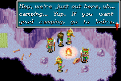 As soon as the party exits out of Dehkan Plateau's east end early in The Lost Age, it is possible for them to detour far to Indra's southwest end and enter Gondowan Cliffs. A dog fixated on a spot on the ground, when Mind Read, will explicitly tell you that you should "dig" there, which you do not have the Psynergy to perform yet. You can follow the winding trail into a cave in the cliffs and approach four Kibombo tribe warriors huddled around a campfire, who will act suspiciously. The only relevance taking this step has on the quest is that, when the town of Madra to the east is revisited after defeating Briggs in Alhafra at Osenia far to the east, the cutscene that plays at the gate will have Kraden mentioning that the tribesmen encountered in the cave played a part in the town's misfortunes that will have taken place in the party's absence.