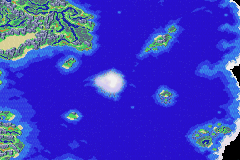 The Eastern Sea has many large land masses situated entirely within it such as Izumo, Treasure Isle, Sea of Time Islet and the Apojii Islands, as well as three Islets of medium importance. The Eastern Sea also completely surrounds the turbulent Sea of Time (which in itself surrounds the island city of Lemuria). Due to swift currents, dangerous reefs and perpetual mists that surround the smaller Sea of Time, the two seas are considered distinctly separate areas despite sharing the same waters.