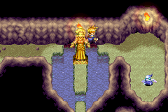 Golden Sun: Gust is found in a cavern beneath the town of Bilibin. The gold statue of Lady McCoy in the center of town conceals an entrance into the cave, and you can shove it aside to reveal the ladder right under it. But on going into the cave, players will realize that though they can see Gust off to the right, another gold statue bars the way. The actual method of reaching Gust is to go up the stairs to the right of the statue outside, and walk south until you're walking clockwise on top of the wooden battlement. A cave entrance on the west side of town leads to the same underground cave, but to the left of the gold statue. Move the statue one space south, and hop right to where Gust awaits.