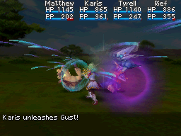 When Gust is unleashed in battle, the user attacks a target with a Jupiter-based attack equal in power to the user's normal physical attack with an additional 10 damage points added to the result. There's a chance that all of the resultant damage will double.