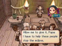 With all the Umbra Gear and Orbs in hand, the group travels to the Apollo Lens. There, Himi assists the party in the final defeat of the Tuaparang commanders, Blados and Chalis, and witnesses the activation of the Apollo Lens as well as the end of the Grave Eclipse. After the eclipse ends, Himi and the group return to Belinsk, where the Eclipse had begun. There, Himi waits at the town gates to see Matthew, Karis, and Tyrell off, as the three return to their home. Eoleo promises to drop her off in Yamata before heading home himself.