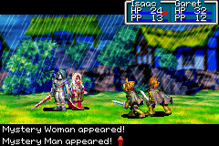 While Isaac's party scales Jupiter Lighthouse, however, they are suddenly divided by a trap that separates Garet and Mia from the others, and Isaac and Ivan are immediately approached by a new duo of Mars Adepts, Karst and Agatio. Isaac, evidently strained from prior events as is, immediately and brusquely tells them to leave him be so that he can save his friends on his own, but Karst and Agatio gleefully confirm their involvement in the trap. Isaac correctly determines that they hail from the same clan as Saturos and Menardi; indeed, they have come down south all the way from the declining village of Prox to exact revenge upon Isaac for his murder of their clansmen (and family, in the case of Karst). Isaac and Ivan desperately engage Karst and Agatio in a two-on-two battle but are overpowered in the end.