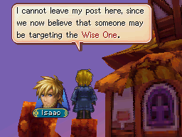 At the pinnacle of Mars Lighthouse, Isaac and Felix's party are shocked to find the Wise One himself waiting to rebuke them. The Wise One demands to know why Isaac has disobeyed his command to recover the Elemental Stars and is now trying to break Alchemy's seal, and Isaac joins everyone else in explaining what they found out about the creeping doom facing Weyard on account of it. Isaac, in particular, mounts a retort against the Wise One's suggestion that Prox must "pay the price" for the "sin" of enacting the effort to light the Lighthouse Beacons.