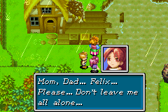 Needless to say, the next three years were very trying for Jenna, who was effectively orphaned. Her grandparents and aunt immediately took her in, and she lived with them in their house on the other side of the river where the tragedy took place. Over the years, she would make it a routine to stand idly at the remains of her original residence, which was never torn down. Responding to her grief, Isaac and Garet would partly blame themselves for not having yet possessed an aptitude in Psynergy that might have made a difference and saved the lives of the four victims, so they devoted their time to studying and training in their Psynergy.