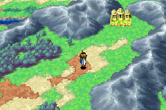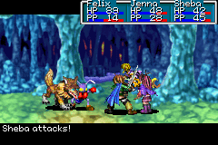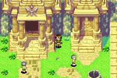 It is possible to slide down a purple wall slide just out of the southwest exit of the chamber with the Lash Pebble, then cast Lash on the coiled rope to turn it into a "climbable ladder" that lets you climb back up to that level of the temple. Far more importantly, you will want to retrace your steps back north from the Lash Pebble chamber, back through the boss area, and back several screens until you reach the area with the visible Mercury Djinni you passed by, and cast Lash on the coiled rope to be able to climb up to it. Battle it to obtain it as the Mercury Djinni Fog, though be warned that any Djinni battled has the chance to flee in a given turn. If this happens to you, you will have to exit out of the door and reenter it to make the Djinni reappear. Once you have gotten it, you can save time leaving Kandorean Temple by casting the Retreat Psynergy. The main gate outside the temple, meanwhile, has permanently opened up.