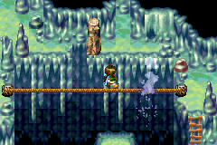 The next area features gaping pits with tightropes crossing them in the distance. Take the left, narrow branch and follow along until you reach the downstairs staircase at the northwest corner of the area, and you will climb down into an area where a rushing stream of water pushes you through a maze of rocks. Follow along the lime-colored ground running parallel left of the river until you get to an open, crossable part of it at its south end, and hold the run button while traveling east across the water to force your way back north. Use this running approach to travel the entire way up through the center of the rushing river, which will let you touch down on the lime-colored ground running parallel right of the river. Follow along to the next area.