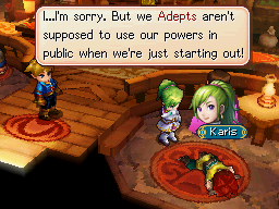 Shortly after leaving Isaac's cabin, Karis and her two friends stop by Patcher's Place, and her frustrations with Tyrell seemingly come to a head. When it is told that Tyrell nearly burned Patcher's Place down with his Mars Psynergy on a previous visit, Tyrell is frustrated that Patcher never forgets these sorts of things even though nothing bad had happened in the end, and starts to let loose some of his fire Psynergy; to prevent him from a second chance at burning down the store, she shoves him to the floor and angrily berates him. Within a moment, Karis breaks down and starts crying in apology, and lectures that it is their responsibility as Adepts to make sure they never use Psynergy in public or hurt people, since their fathers are concerned about people viewing Psynergy and the Adepts that use it as helpful rather than hurtful. Tyrell eventually agrees not to use Psynergy in front of strangers, and recognizes and appreciates that his friends are always looking out for him. Tyrell and Karis' companionship improves from that point onward.
