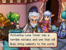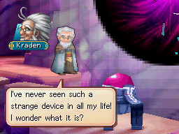 Surprisingly, all of the Warriors who were engulfed in the energy atop Mars Lighthouse had vastly slowed their rates of aging, and Kraden — despite not being an Adept like the rest of them — received the same benefit. Thus, even as of 30 years after the Golden Sun event, Kraden is still capable of traveling the world of Weyard like he had at the age of 70, though he is somewhat more forgetful. Kraden and the rest of the Warriors would largely work separately to watch over the changing world, primarily motivated by the emergence of bizarre and threatening new phenomena such as the Psynergy Vortexes. Kraden theorizes that the vortexes are pure anti-Psynergy created by exceptionally dense concentrations of Psynergy, which became an outcome of the elemental influences of the Lighthouses. He is pouring his own efforts into finding some sort of explanation for the horrific Mourning Moon vortex that has been appearing every ten years.