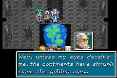 Lunpa brings Kraden and Felix's party into Hydros' throne chamber to hold counsel with the king, who reveals that he had originally sent Piers out of Lemuria to observe and map the outside world to confirm his theory that Weyard itself is on a path to destruction. Hydros shows a map of ancient Weyard and compares it to the world map Lunpa had brought with him when he first came to Lemuria a century ago, and the more recent map shows the various landmasses of Weyard having since broken up and shrunken in size. Piers' own exploration of the Eastern Sea confirmed that the continents have shrunk even further in the years since.
