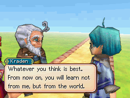 Kraden, for once, cannot infer anything about this mysterious and obviously ancient item Volechek entrusted them. However, citing that Matthew and Rief's party had managed to restart the Alchemy Machines and traverse Craggy Peak without him, Kraden speaks highly of the party's determination and skill. Since he merely specializes in studying the past, he judges the party's tenacity to be what they should rely on in their efforts to address the present and future, and so they should make a proactive effort to find out more about the Orb and how to stop the eclipse. Kraden appraises Matthew as worthy of continuing his leadership role, and everyone else agrees. Kraden suggests they start their efforts to break away from their enemies' schemes by finding a settlement that can observe the fully formed dome of the eclipse from the outside.